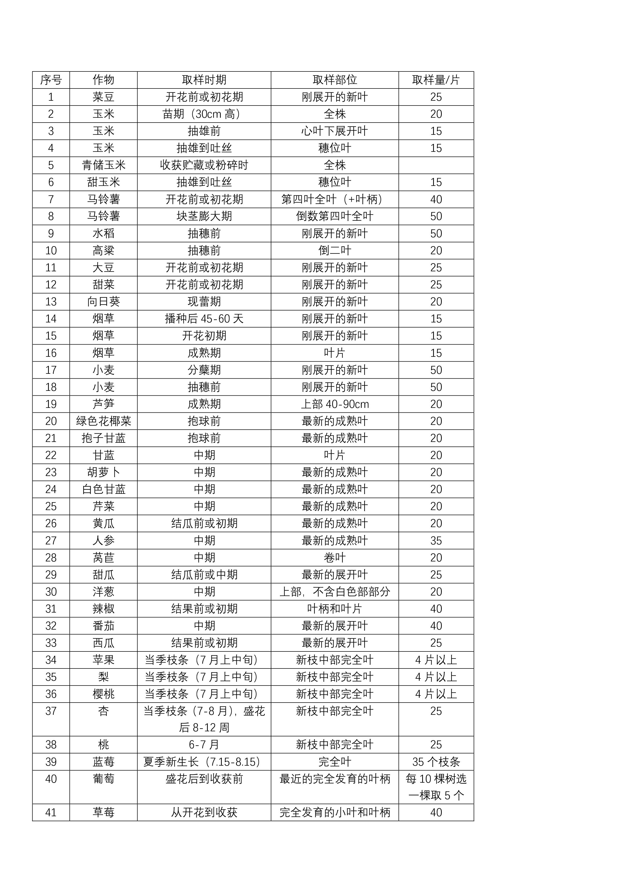 根据作物以及生长时期的不同,选择合理的取样方法及取样量(见表)。如长势均匀一致,可随机取样,如有缺素表现,可典型取样;尽量使样品具有代表性。